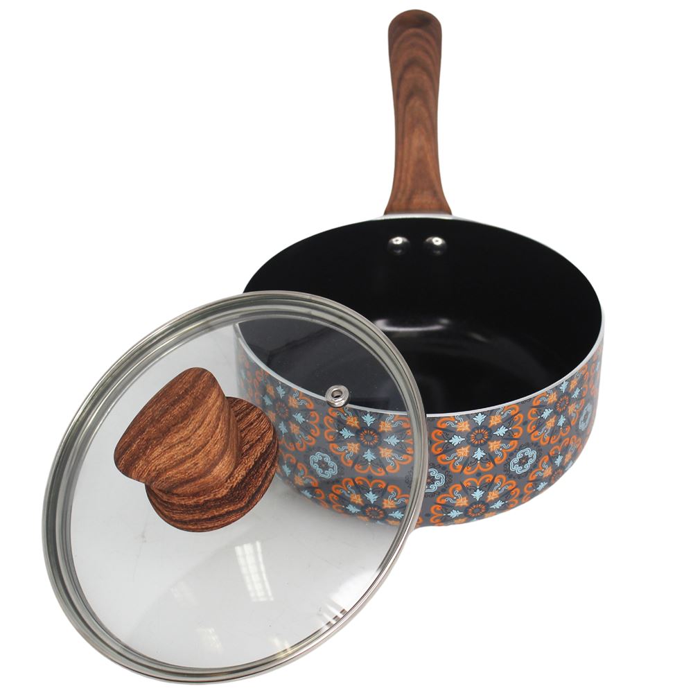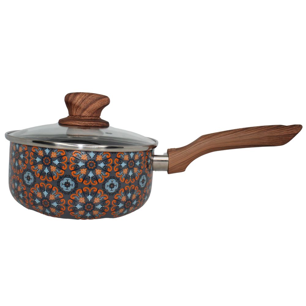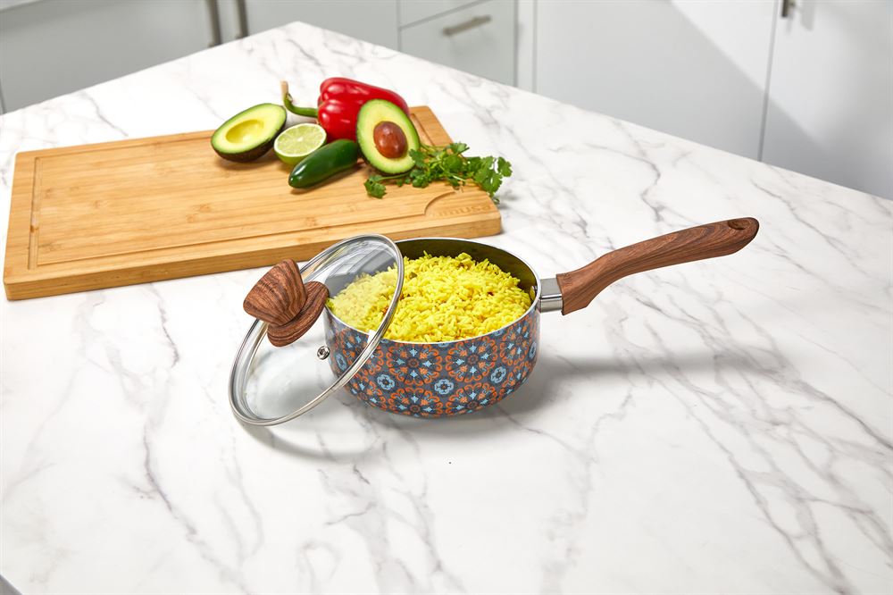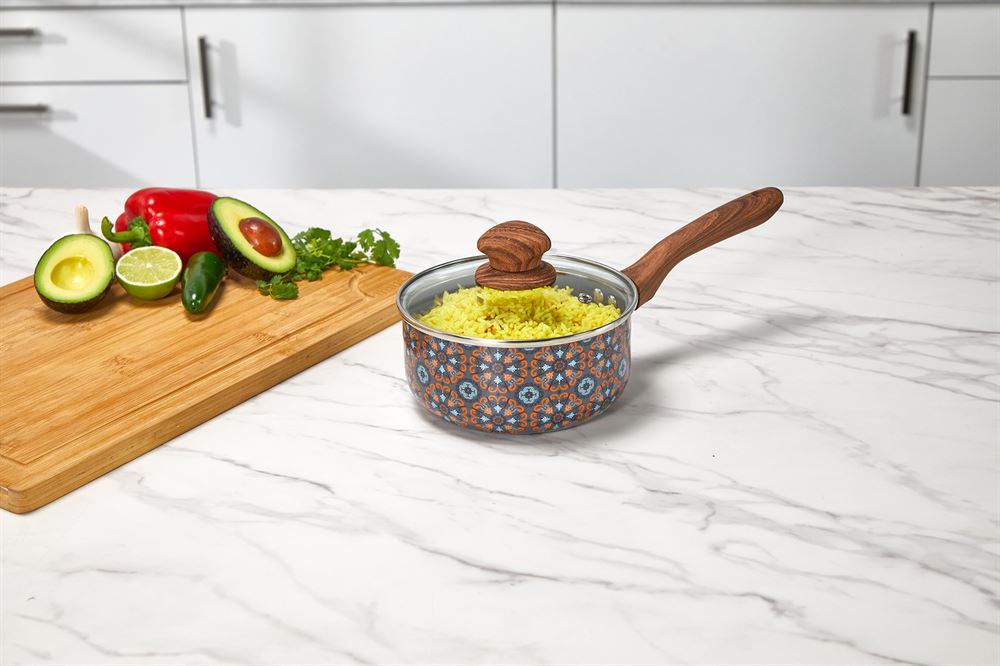 The IMUSA Talavera 1.5Qt Aluminum Black Ceramic Saucepan is an essential piece in every kitchen. This saucepan showcases an authentic and traditional Talavera exterior design that gives a special touch to any kitchen and features a nonstick ceramic coating allowing for easy food release and providing easy cleanup. The IMUSA Talavera Saucepan has a capacity of 1.5 quarts. The woodlook stay-cool side handle provides a comfortable grip, allowing you to maneuver it effortlessly as you create culinary masterpieces, and the tight-fitting glass lid is ideal for monitoring foods while in use. The IMUSA Talavera Saucepan is ideal for authentic Mexican dishes, heating small portions, boiling, and for culinary explorers who want to bring the essence of Mexican gastronomy to their kitchens. Whether you are cooking posole, tortilla soup, caldo de res, sauces, mole, or melting butter, the IMUSA Talavera Saucepan delivers exceptional results each time. Trust the IMUSA Talavera Saucepan for balanced, home-cooked meals. It will surely become your kitchen’s beloved companion, uniting tradition, and innovation in every delectable creation and elevating your culinary experience.