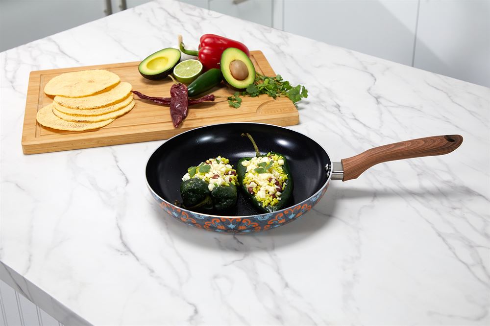 The IMUSA Talavera 10″ Aluminum Black Ceramic Frypan is an exceptional addition to any kitchen, designed for both style and functionality. This frypan showcases an authentic and traditional Talavera exterior design that gives a special touch to any kitchen and features a nonstick ceramic coating allowing for healthier cooking with minimal oil and providing effortless food release and easy cleanup. This frypan comes in a size of 10 inches. The cool-touch wood look handle of the IMUSA Talavera Frypan provides a secure and comfortable grip, enhancing safety and ease of use in the kitchen. The IMUSA Talavera Frypan is ideal for pan frying, and stir-frying, and is used for preparing authentic Mexican dishes such as huevos rancheros, chilaquiles, enchiladas, quesadillas, and many more. Its stylish yet practical design makes it a versatile and indispensable tool for any home cook looking to create delicious and nutritious meals with ease. Trust the IMUSA Talavera Frypan for balanced, home-cooked meals. It will surely become your kitchen’s beloved companion, uniting tradition, and innovation in every delectable creation and elevating your culinary experience.