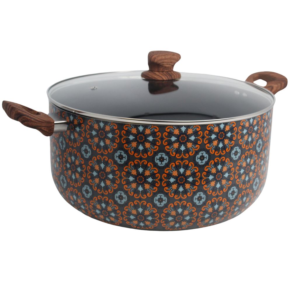 The IMUSA 10Qt Talavera Aluminum Black Ceramic Dutch Oven is an exceptional addition to any kitchen, designed for both style and functionality. This Dutch Oven showcases an authentic and traditional Talavera exterior design that gives a special touch to any kitchen and features a nonstick ceramic coating allowing for easy food release and providing easy cleanup. The IMUSA Talavera Dutch Oven has a capacity of 10 quarts. The dual side cool-touch wood look handles and knob provide a secure and comfortable grip, enhancing safety and ease of use and the included glass lid allows you to monitor your cooking progress. The IMUSA Talavera Dutch Oven is ideal for a wide range of cooking techniques, including long-simmering mixtures, boiling, steaming, and blanching. It is perfect for preparing traditional dishes such as pozole, horchata, tortilla soup, caldo de res soup, stews, pasta, and more. The IMUSA Talavera Dutch Oven is perfect for cooking large meals for family gatherings or meal prepping for the week. Its stylish design and practical features make it a versatile and indispensable tool for any home cook looking to create delicious and nutritious meals with ease. Trust the IMUSA Talavera Dutch Oven for balanced, home-cooked meals. It will surely become your kitchen’s beloved companion, uniting tradition, and innovation in every delectable creation and elevating your culinary experience.