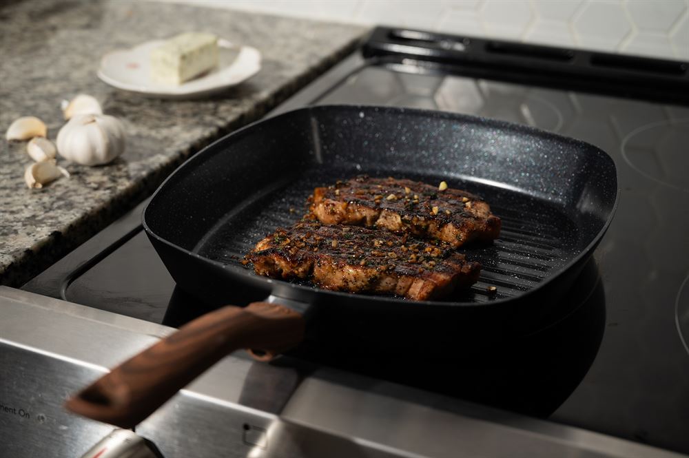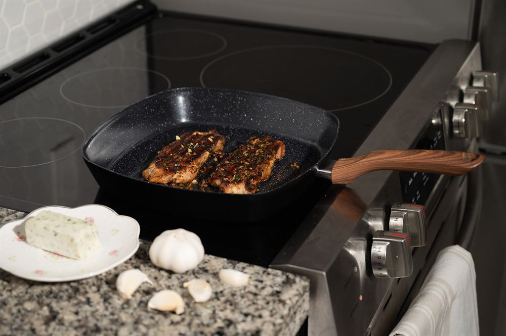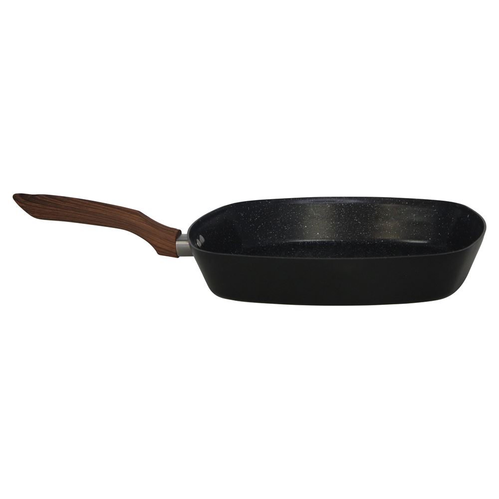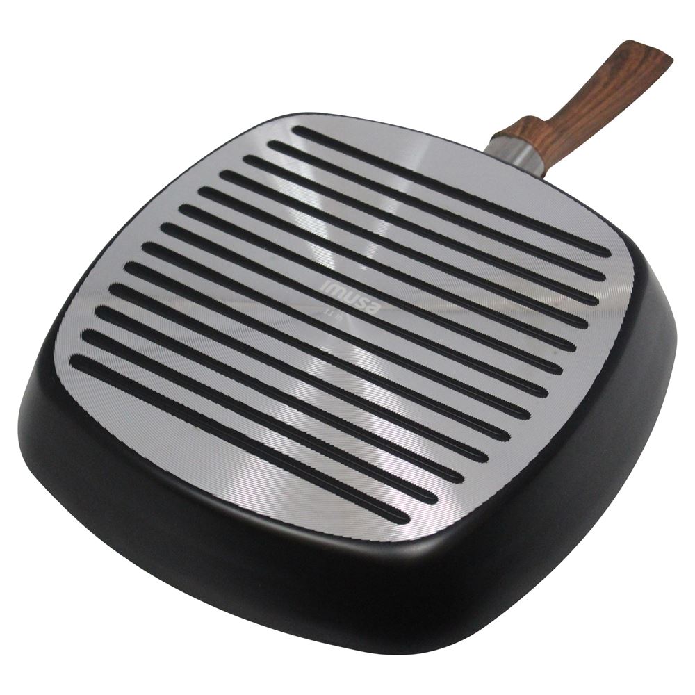 The IMUSA 11” Madera Ceramic Square Grill is a versatile and high-performance kitchen essential. Constructed from durable aluminum and coated with a stylish black speckled ceramic interior and matte black exterior, it combines sleek design with functionality. The ceramic nonstick coating ensures effortless food release and healthier cooking, making it ideal for a variety of dishes such as burgers, bacon, vegetables, sandwiches, fish, chicken, and BBQ steaks. The cool-touch woodlook handle provides a comfortable grip for easy operation, while the high walls prevent spills and make food transfer hassle-free. With its spacious cooking surface, this grill allows for larger portions to be prepared at once, making it perfect for grilling and toasting for family meals or gatherings. Trust the IMUSA ” Madera Ceramic Square Grill for balanced, home-cooked meals. It will surely become your kitchen’s beloved companion, uniting tradition, and innovation in every delectable creation and elevating your culinary experience.