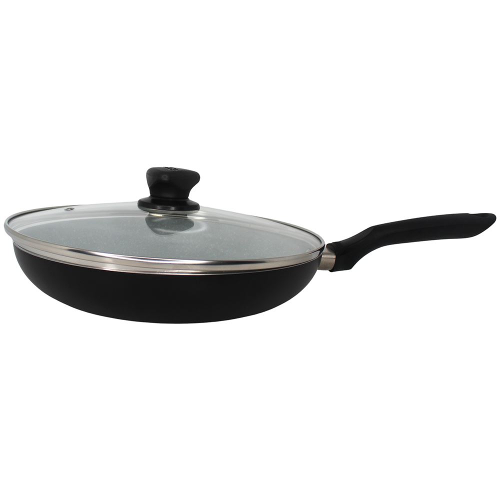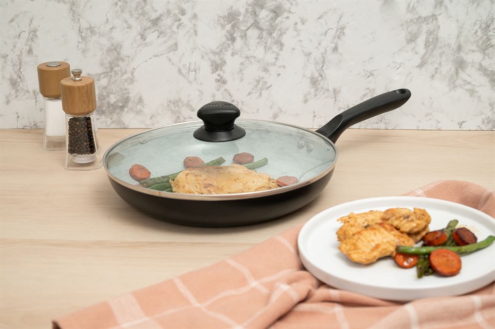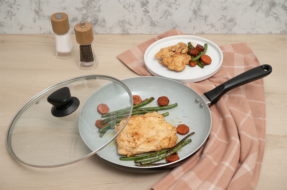 The IMUSA 11” Premier Cera Fry Pan is crafted from durable aluminum, featuring a stunning gray speckled Ceramic coating and a sleek matte black exterior finish. This Ceramic non-stick coating ensures effortless food release and promotes healthier cooking, making meal prep a breeze. Designed with user comfort in mind, the cool-touch handle allows for easy operation, while the tight-fitting glass lid with a steam vent provides excellent heat retention and splatter control. Perfect for a variety of dishes, this fry pan excels in chicken stir-fry, frittatas, seared salmon, one-pan pasta, and sautéing vegetables or eggs. With its combination of functionality and contemporary design, the IMUSA Premier Cera Fry Pan is an essential tool for anyone looking to elevate their cooking experience, allowing for delicious meals with minimal fuss. Trust the IMUSA Premier Cera Fry Pan for balanced, home-cooked meals. It will surely become your kitchen’s beloved companion, uniting tradition, and innovation in every delectable creation and elevating your culinary experience.