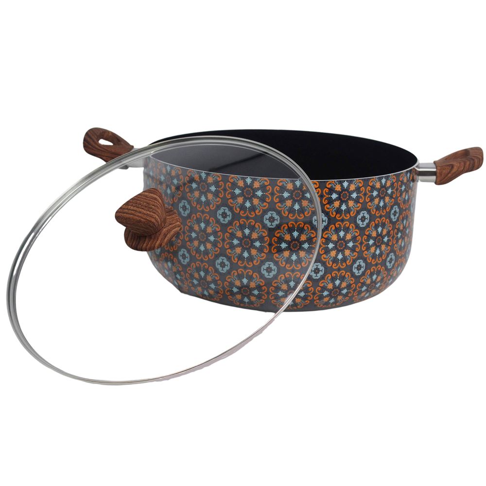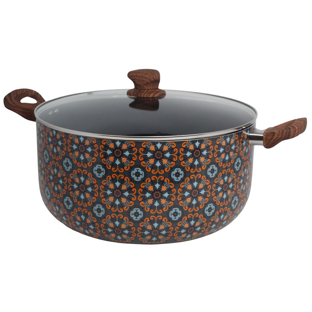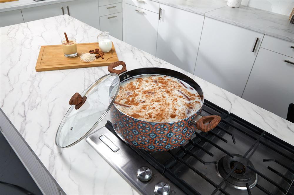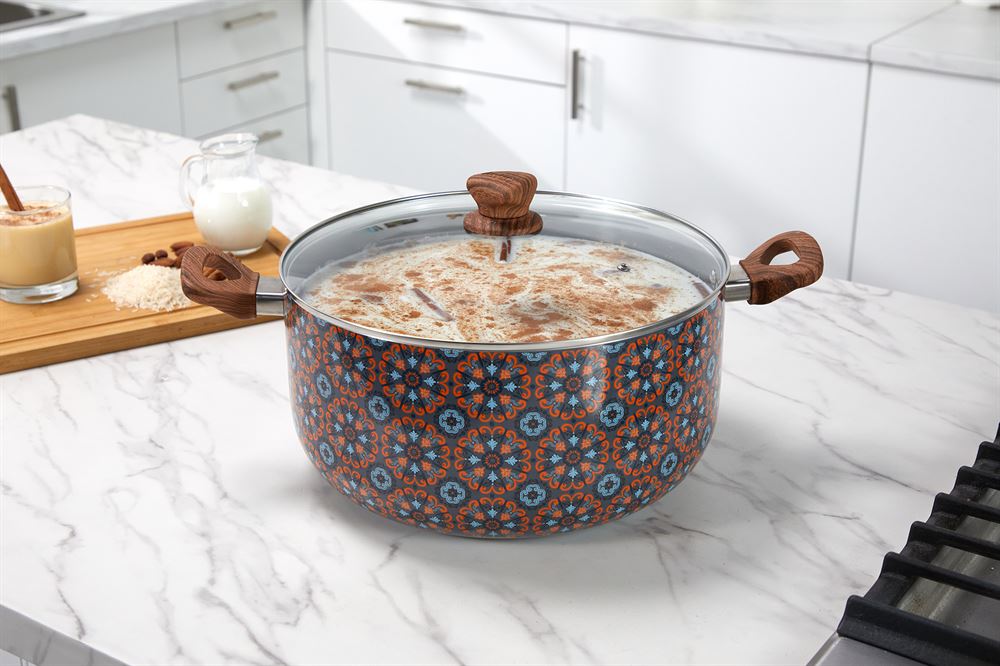 The IMUSA 12.7Qt Talavera Aluminum Black Ceramic Dutch Oven is an exceptional addition to any kitchen, designed for both style and functionality. This Dutch Oven showcases an authentic and traditional Talavera exterior design that gives a special touch to any kitchen and features a nonstick ceramic coating allowing for easy food release and providing easy cleanup. The IMUSA Talavera Dutch Oven has a capacity of 12.7 quarts. The dual side cool-touch wood look handles and knob provide a secure and comfortable grip, enhancing safety and ease of use and the included glass lid allows you to monitor your cooking progress. The IMUSA Talavera Dutch Oven is ideal for a wide range of cooking techniques, including long-simmering mixtures, boiling, steaming, and blanching. It is perfect for preparing traditional dishes such as pozole, horchata, tortilla soup, caldo de res soup, stews, pasta, and more. The IMUSA Talavera Dutch Oven is perfect for cooking large meals for family gatherings or meal prepping for the week. Its stylish design and practical features make it a versatile and indispensable tool for any home cook looking to create delicious and nutritious meals with ease. Trust the IMUSA Talavera Dutch Oven for balanced, home-cooked meals. It will surely become your kitchen’s beloved companion, uniting tradition, and innovation in every delectable creation and elevating your culinary experience.