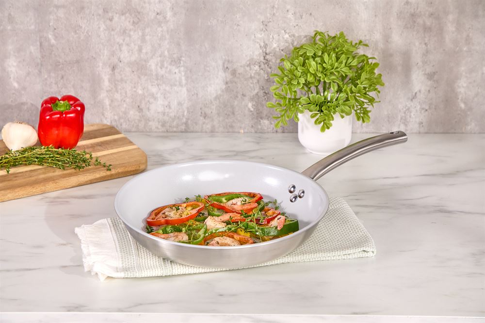 The IMUSA 12” Fry Pan is designed for those who need a larger pan for cooking big meals without compromising on quality or performance. Made with a combination of aluminum and stainless steel, it delivers exceptional heat distribution and retention, ensuring your food is cooked evenly every time. The ceramic nonstick coating promotes healthier cooking by allowing food to release effortlessly while reducing the need for excessive oil. The polished stainless-steel handle offers a sleek, modern touch and a comfortable, secure grip. Oven-safe and induction stove-compatible, this pan is perfect for a variety of cooking methods. Whether you’re pan frying, stir-frying, sautéing meats and vegetables, or preparing oven-baked frittatas, this 12” fry pan is ideal for everyday home use and dry heat cooking. It’s a versatile tool that will make meal preparation easier and more enjoyable. Trust the IMUSA Ceramic Fry Pan for balanced, home-cooked meals. It will surely become your kitchen’s beloved companion, uniting tradition, and innovation in every delectable creation and elevating your culinary experience.