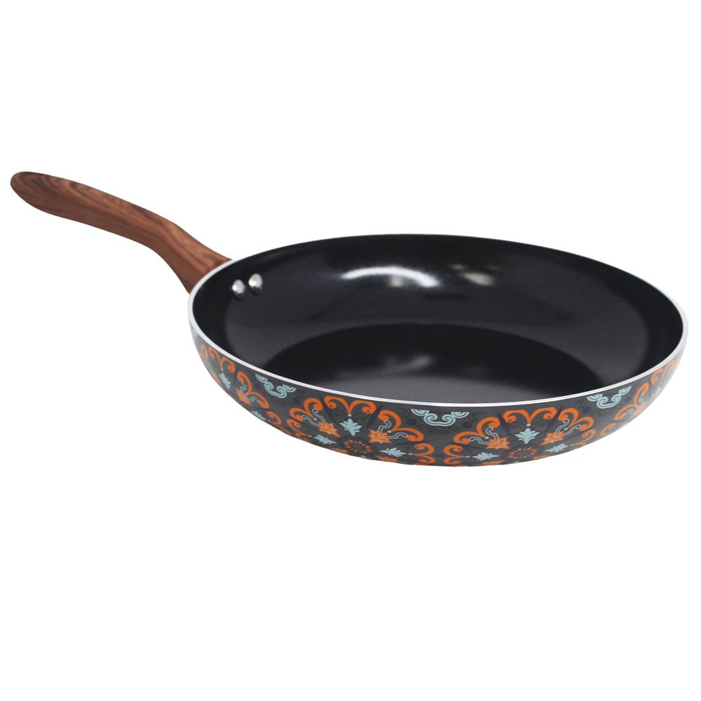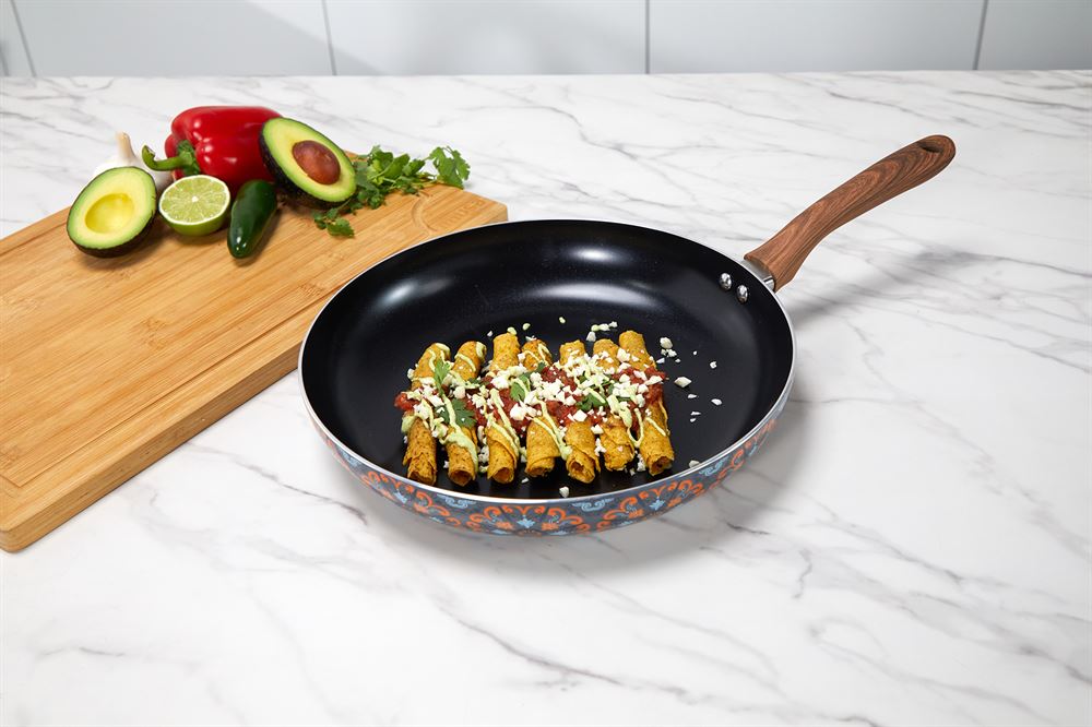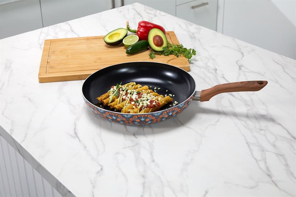 The IMUSA Talavera 12″ Aluminum Black Ceramic Frypan is an exceptional addition to any kitchen, designed for both style and functionality. This frypan showcases an authentic and traditional Talavera exterior design that gives a special touch to any kitchen and features a nonstick ceramic coating allowing for healthier cooking with minimal oil and providing effortless food release and easy cleanup. This frypan comes in a size of 12 inches. The cool-touch wood look handle of the IMUSA Talavera Frypan provides a secure and comfortable grip, enhancing safety and ease of use in the kitchen. The IMUSA Talavera Frypan is ideal for pan frying, and stir-frying, and is used for preparing authentic Mexican dishes such as huevos rancheros, chilaquiles, enchiladas, quesadillas, and many more. Its stylish yet practical design makes it a versatile and indispensable tool for any home cook looking to create delicious and nutritious meals with ease. Trust the IMUSA Talavera Frypan for balanced, home-cooked meals. It will surely become your kitchen’s beloved companion, uniting tradition, and innovation in every delectable creation and elevating your culinary experience.