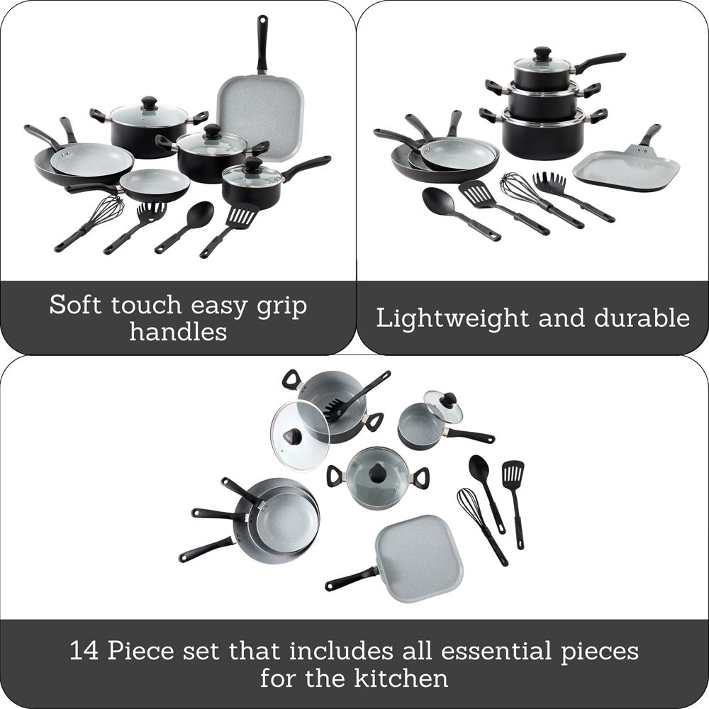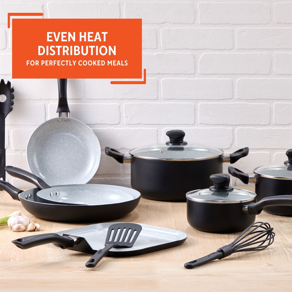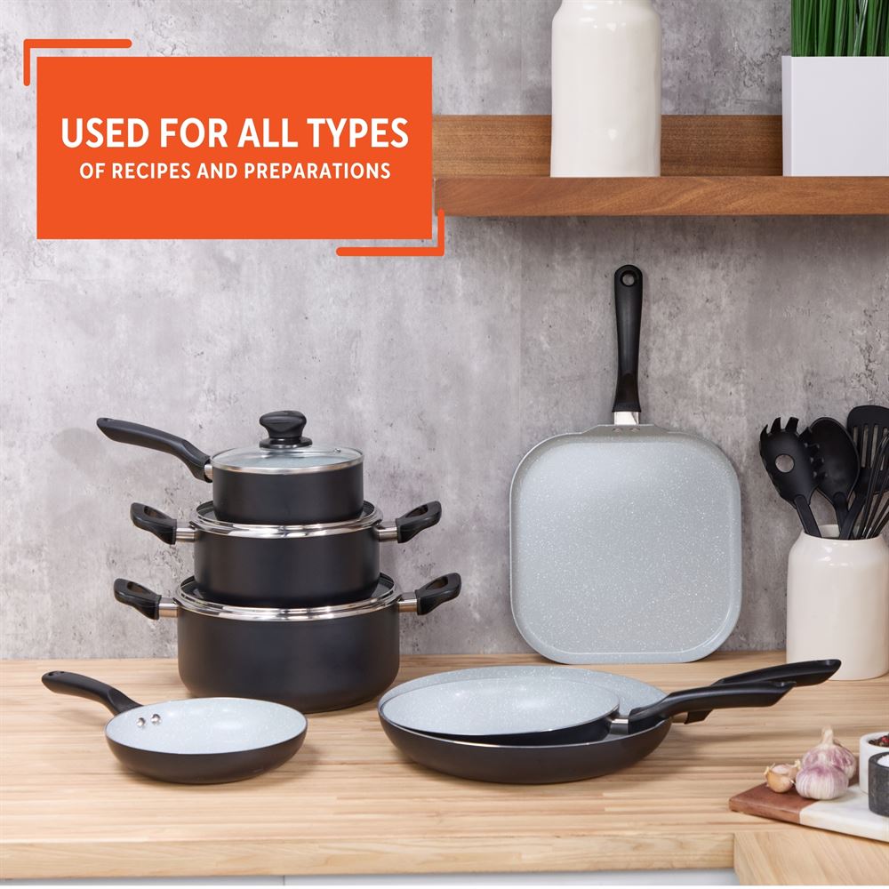 The IMUSA 14-Piece Premier Ceramic Set includes all the essential pieces you need for versatile cooking. The matte black exterior adds a sleek touch to your kitchen. Each piece is designed with soft-touch easy-grip handles and tight-fitting glass lids with steam vents, ensuring comfort and convenience during cooking. This 14-Piece Premier Ceramic Set is perfect for all types of recipes and meal preparations, making it ideal for everyday use. It also makes a thoughtful gift for housewarming, weddings, Mother’s Day, and other special occasions. Trust the IMUSA 14-Piece Premier Ceramic Set for balanced, home-cooked meals. It will surely become your kitchen’s beloved companion, uniting tradition, and innovation in every delectable creation and elevating your culinary experience.