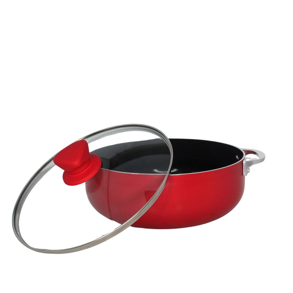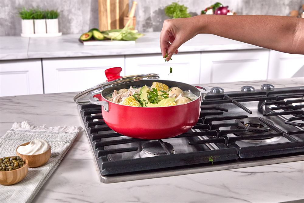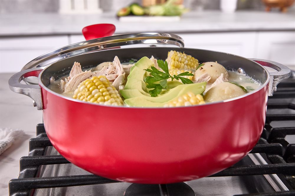 The IMUSA 3.2Qt Aluminum Dutch Oven is a versatile and stylish kitchen essential, crafted from durable aluminum to ensure even heat distribution for consistent cooking results. Its black ceramic non-stick coating allows for effortless food release and healthier cooking with less oil, while the vibrant red exterior adds a modern touch to your kitchen. Equipped with easy-grip riveted handles and a tight-fitting glass lid featuring a steam vent, this Dutch oven offers secure handling and the convenience of monitoring your dishes as they cook. The red soft-touch knob adds comfort when adjusting the lid, and its oven-safe design (without the lid) provides versatility for various cooking techniques. Ideal for smaller households, it’s perfect for preparing rice, soups, beans, sauces, stews, or baked dishes, whether you’re crafting traditional Hispanic recipes or experimenting with new flavors. Trust the IMUSA 3.2Qt Aluminum Dutch Oven for balanced, home-cooked meals. It will surely become your kitchen’s beloved companion, uniting tradition and innovation in every delectable creation and elevating your culinary experience.