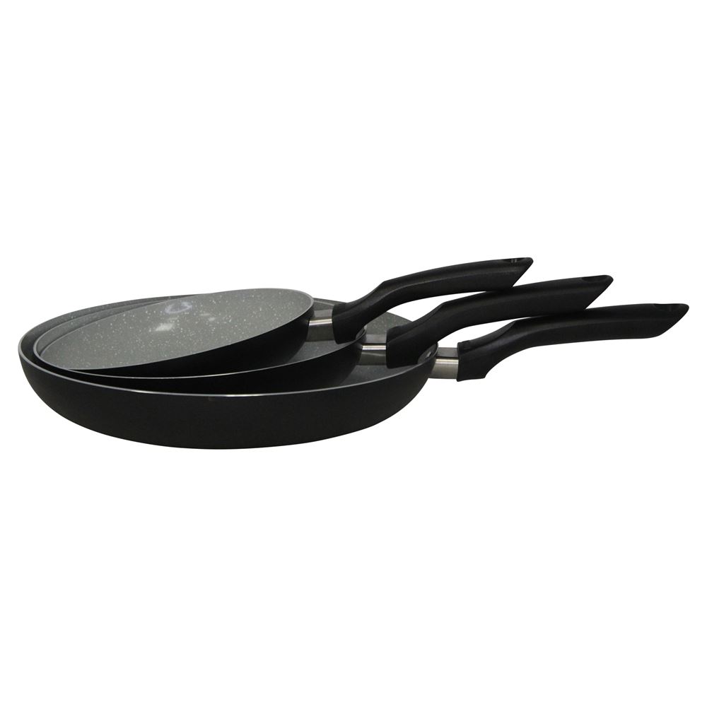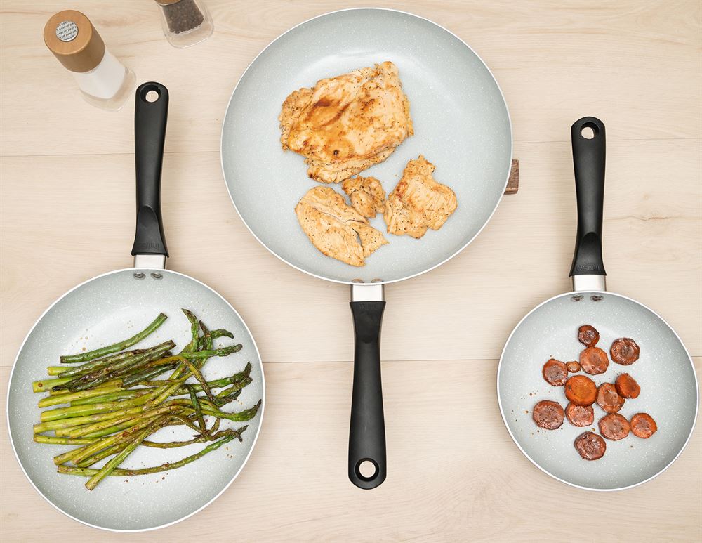 The IMUSA 3-Piece Fry Pan Set includes 8″, 9.5″, and 12″ pans, offering versatility for various recipes and portion sizes. The gray-speckled ceramic coating ensures a nonstick surface for easy food release and healthier cooking with less oil, while the matte black exterior adds a modern touch to your kitchen. These 3-piece Fry Pan Set are perfect for pan frying, stir-frying, and sautéing meat, fish, eggs, and more. The cool-touch handles make for easy and comfortable operation, ensuring safety and convenience in the kitchen. Whether you’re preparing small or large meals, these pans are ideal for everyday use and dry heat cooking. Trust the IMUSA 3-Piece Fry Pan Set for balanced, home-cooked meals. It will surely become your kitchen’s beloved companion, uniting tradition, and innovation in every delectable creation and elevating your culinary experience.