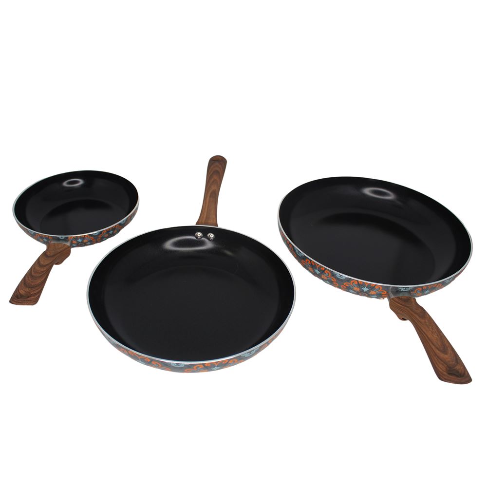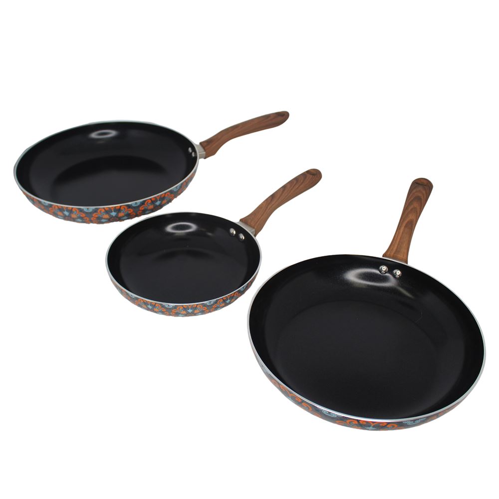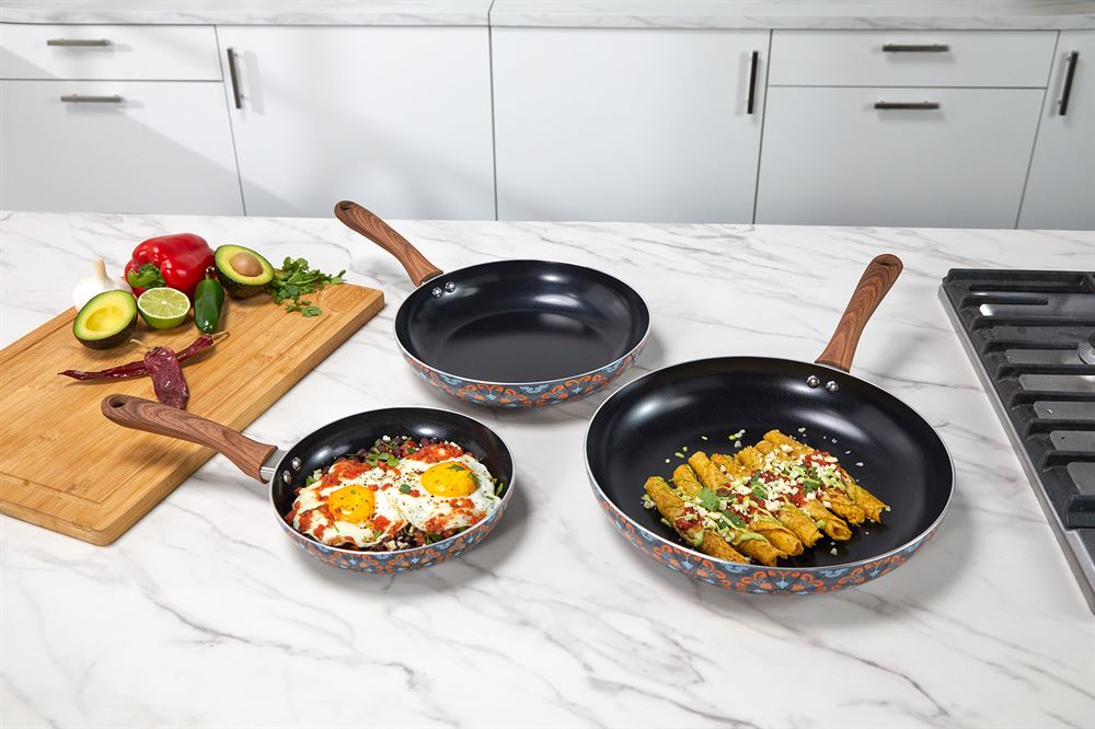 The IMUSA 3-PieceTalavera Value Fry Pan Set includes 7″, 9″, and 11″ pans, offering versatility for a range of recipes and portion sizes. Made of durable aluminum, these pans are coated with a black ceramic nonstick surface for effortless food release and healthier cooking. The authentic Talavera exterior design adds a touch of Mexican heritage to your kitchen. With three different sizes, these fry pans are perfect for small to large portions and are ideal for preparing traditional Mexican dishes like chilaquiles, enchiladas, huevos rancheros, soups, fajitas, mole, and more. The woodlook soft-touch handles provide a comfortable grip for easy and safe handling. Perfect for pan frying, stir-frying, and everyday use, this set is ideal for culinary explorers looking to bring the essence of traditional Mexican gastronomy into their kitchen. Trust the IMUSA 3-Piece Talavera Value Fry Pan Set for balanced, home-cooked meals. It will surely become your kitchen’s beloved companion, uniting tradition, and innovation in every delectable creation and elevating your culinary experience.