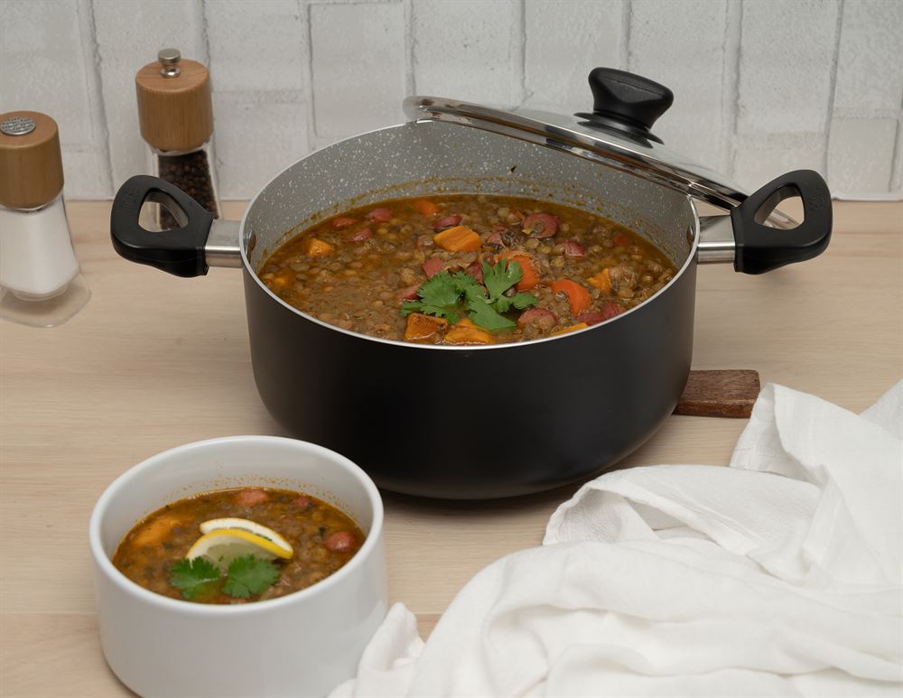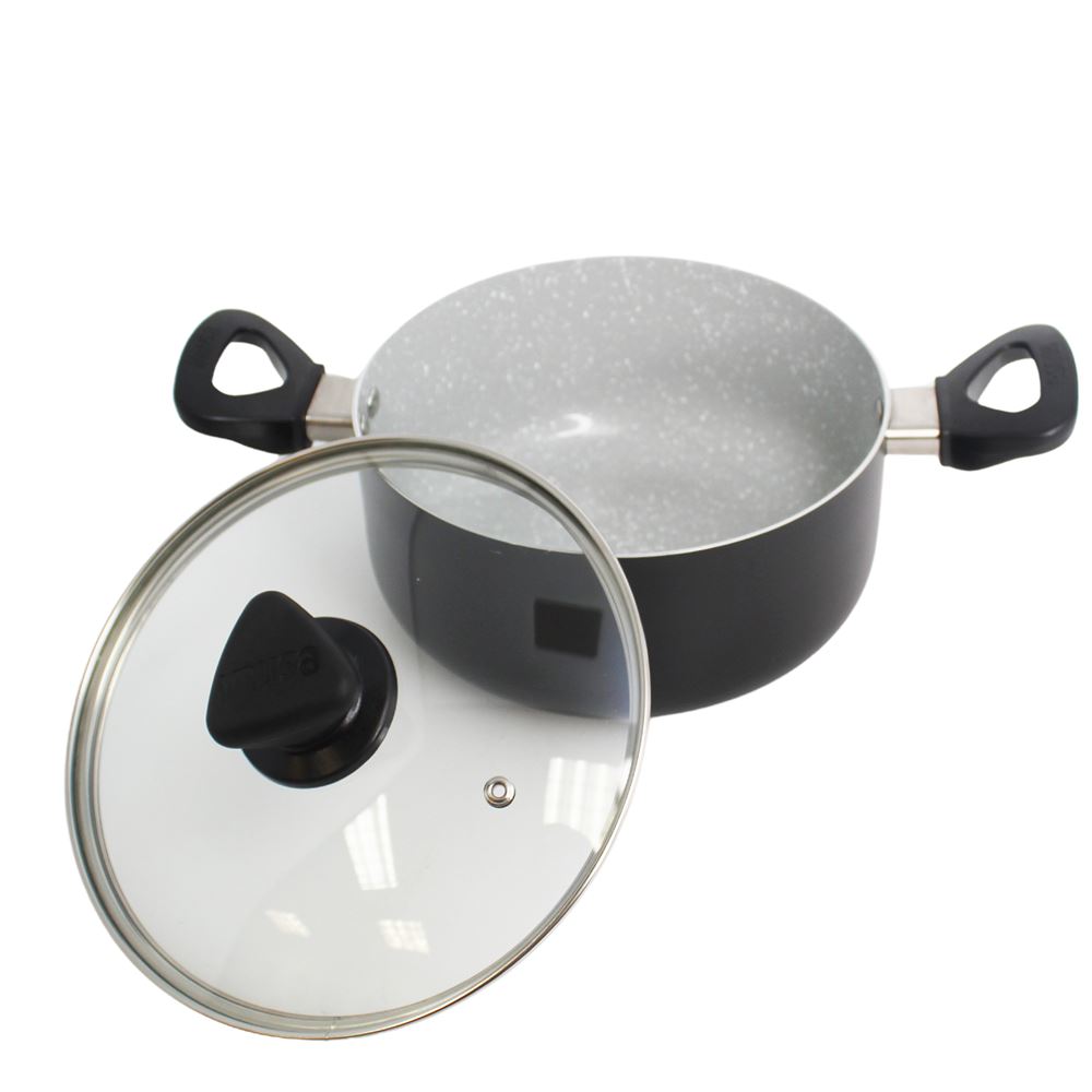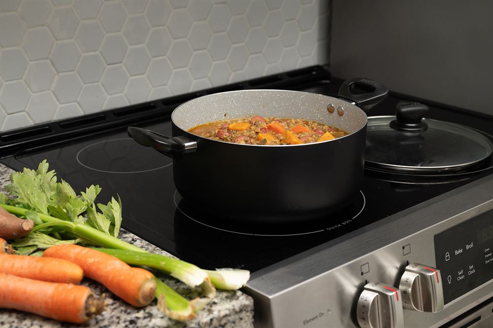 The IMUSA 3Qt Premier Cera Dutch Oven is a versatile cookware piece, perfect for preparing a variety of meals. Made from durable aluminum, it features a stylish gray speckled ceramic coating with a matte black exterior finish. The PFAS-free ceramic non-stick coating ensures healthier cooking with effortless food release. Equipped with dual cool-touch handles and a knob, it provides safe and easy handling, while the glass lid allows you to monitor the cooking process without lifting it, retaining heat and moisture for optimal results. Ideal for preparing soups, stews, chilis, macaroni and cheese, meats, vegetables, and more, this Dutch oven is perfect for long-simmering mixtures, boiling, steaming, and blanching. Trust the IMUSA Premier Cera Dutch Oven as your go-to kitchen helper. It will surely become your kitchen’s beloved companion simplifying and enhancing your culinary endeavors.