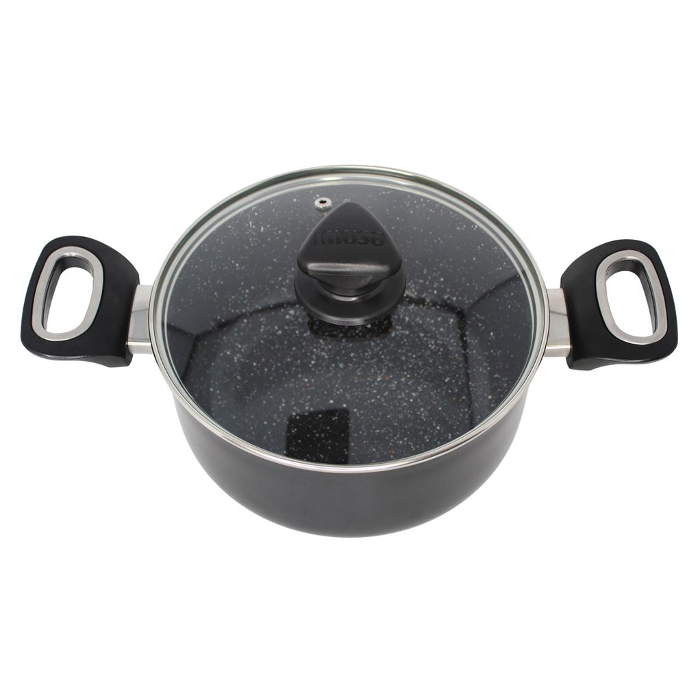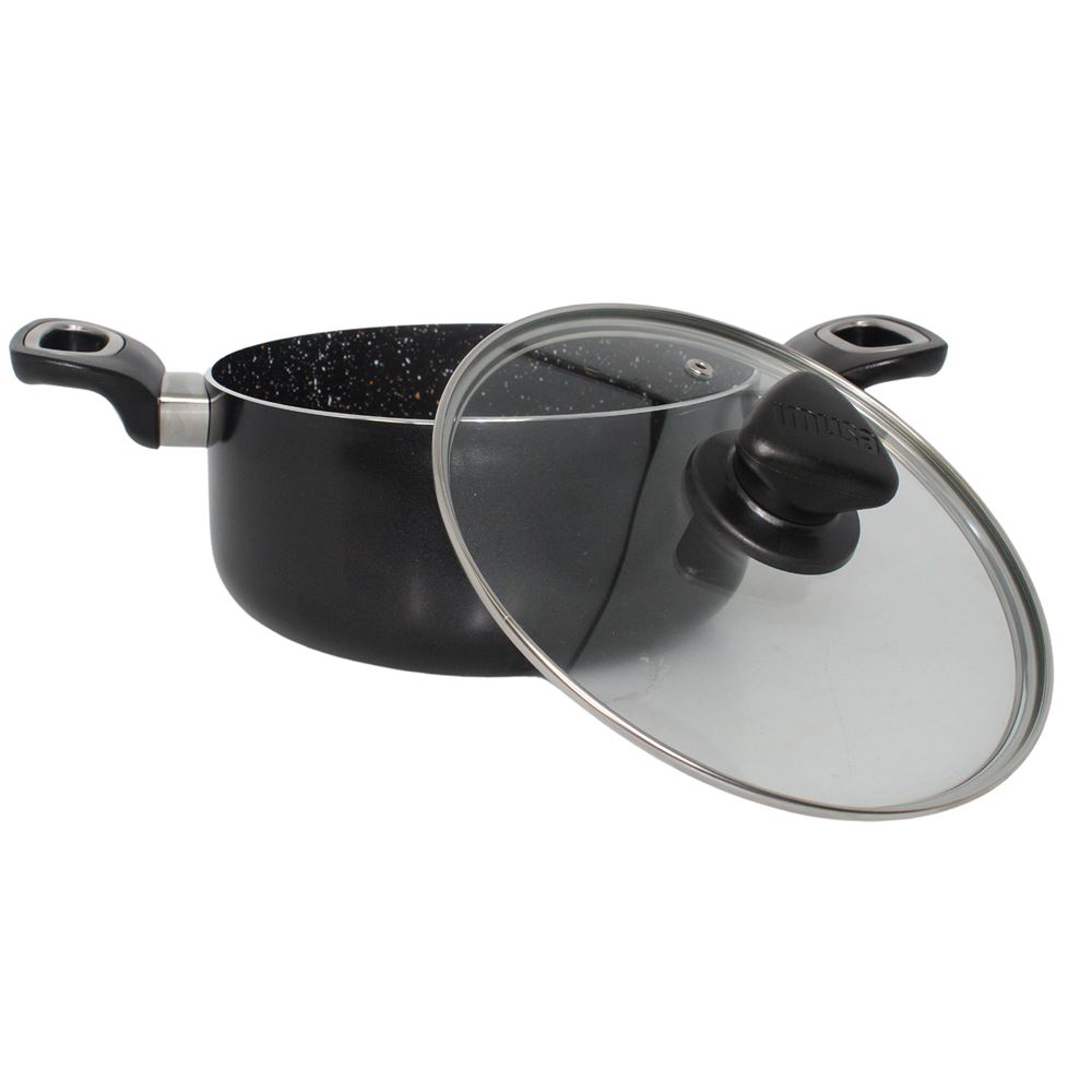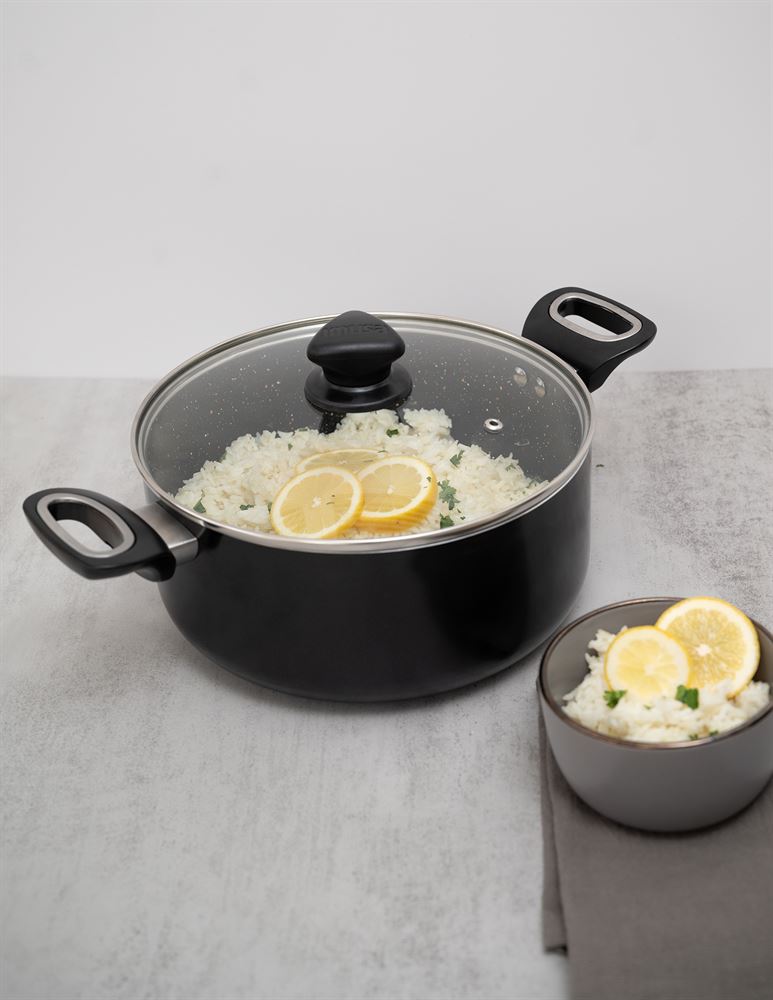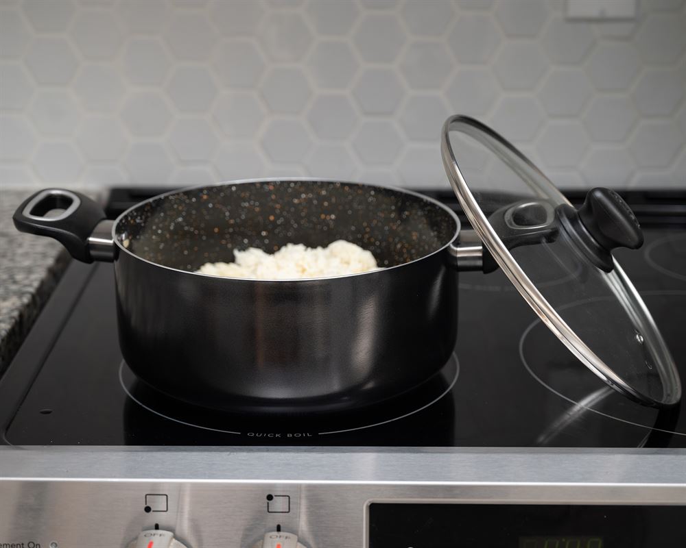 The IMUSA 4.8Qt Premier Ceramic Dutch Oven is constructed from aluminum and features a black speckled Ceramic coating with a sleek black exterior. Its Ceramic nonstick coating ensures effortless food release, promoting healthier cooking. Designed for convenience, it includes dual cool-touch side handles and a knob for easy operation and handling. This Dutch oven is perfect for preparing soups, stews, chilis, meats, vegetables, and more. Ideal for long-simmering mixtures, boiling, steaming, and blanching, it offers versatile cooking options for various hearty meals. Trust the IMUSA Premier Ceramicmic Dutch Oven for balanced, home-cooked meals. It will surely become your kitchen’s beloved companion, uniting tradition, and innovation in every delectable creation and elevating your culinary experience.