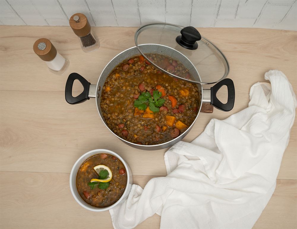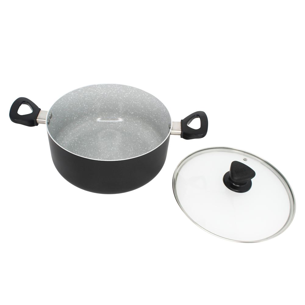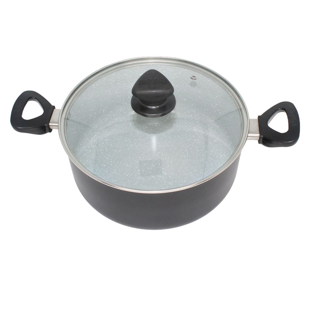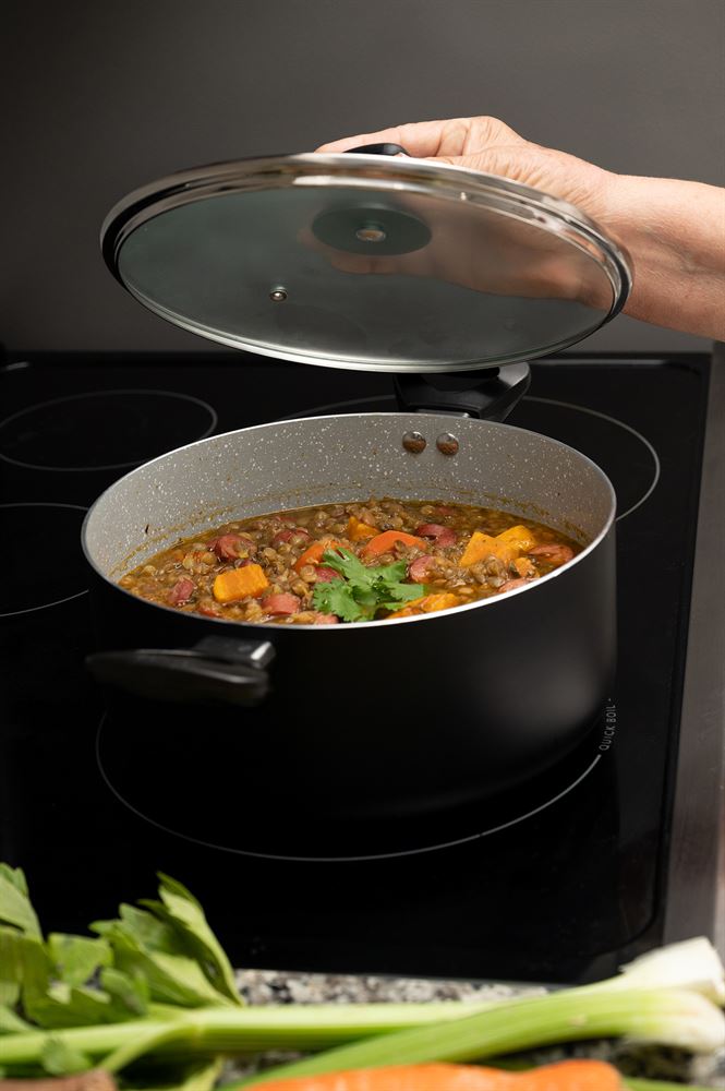 The IMUSA 4.8Qt Premier Cera Dutch Oven is a versatile cookware piece, perfect for preparing a variety of meals. Made from durable aluminum, it features a stylish gray speckled ceramic coating with a matte black exterior finish. The PFAS-free ceramic non-stick coating ensures healthier cooking with effortless food release. Equipped with dual cool-touch handles and a knob, it provides safe and easy handling, while the glass lid allows you to monitor the cooking process without lifting it, retaining heat and moisture for optimal results. Ideal for preparing soups, stews, chilis, macaroni and cheese, meats, vegetables, and more, this Dutch oven is perfect for long-simmering mixtures, boiling, steaming, and blanching. Trust the IMUSA Premier Cera Dutch Oven as your go-to kitchen helper. It will surely become your kitchen’s beloved companion simplifying and enhancing your culinary endeavors.