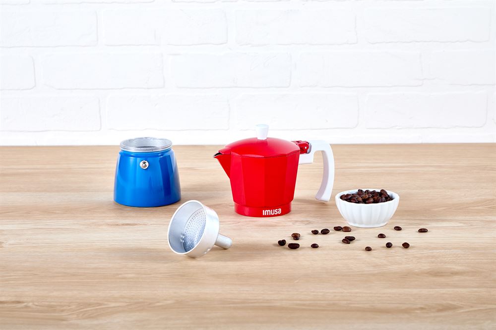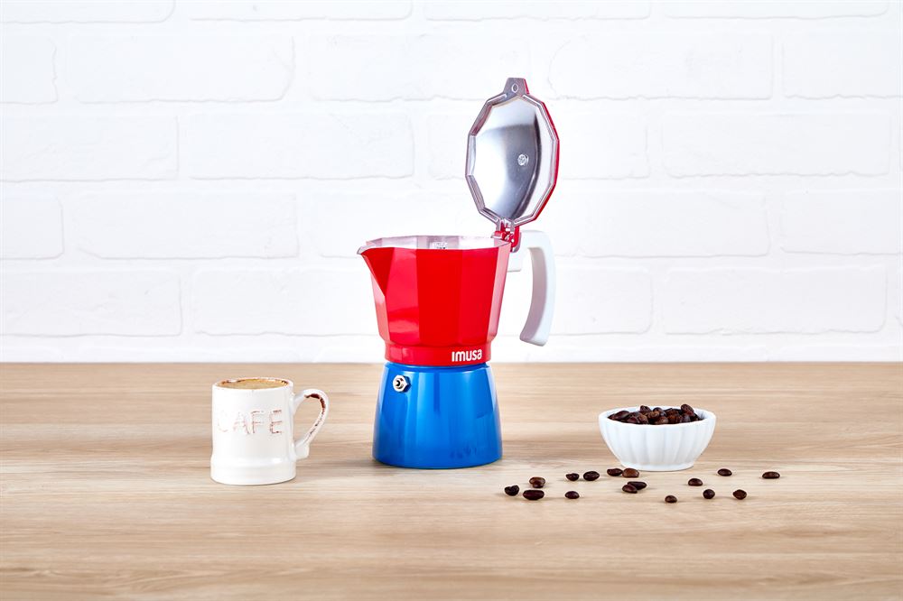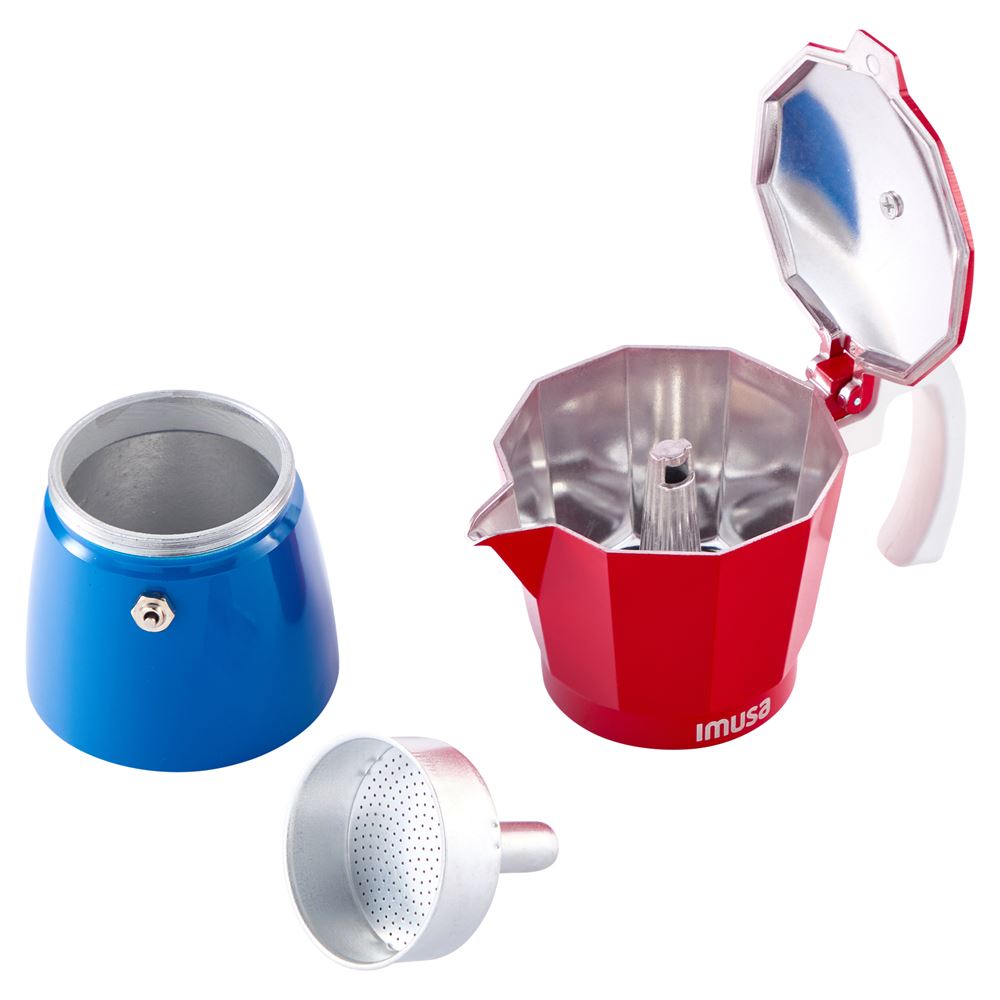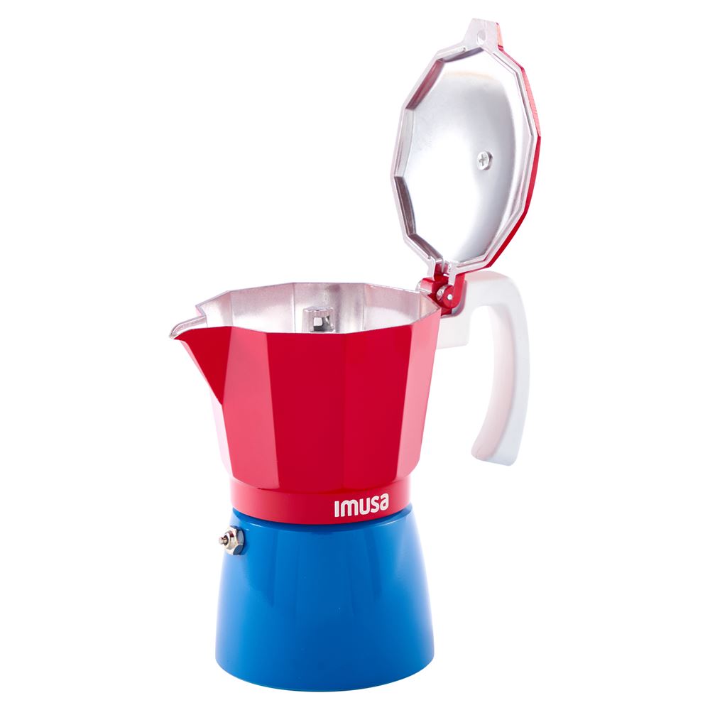 The IMUSA 6 Cup Cast Aluminum Espresso Maker is perfect for coffee enthusiasts who enjoy brewing rich, flavorful coffee in larger batches. Made from high-quality cast aluminum, it ensures even heat distribution for consistently excellent results, whether you’re making espresso, cortadito, Moka, cappuccinos, or Italian-style lattes. This special edition espresso maker features a vibrant “Caribbean colors” design with a striking blue base, red top, and white accents, celebrating the lively culture of Puerto Rico, the Dominican Republic, and Cuba, while adding a pop of color to your kitchen. Its practical flip-top lid, easy-pour spout, and white soft-touch handle and knob offer both comfort and convenience, making it easy to handle and pour. Designed for stovetop use, it enhances the flavor and aroma of every brew and is ideal for family breakfasts, afternoon coffee breaks, or entertaining guests. Reliable and stylish, this espresso maker is a must-have for elevating your coffee experience with both functionality and flair.