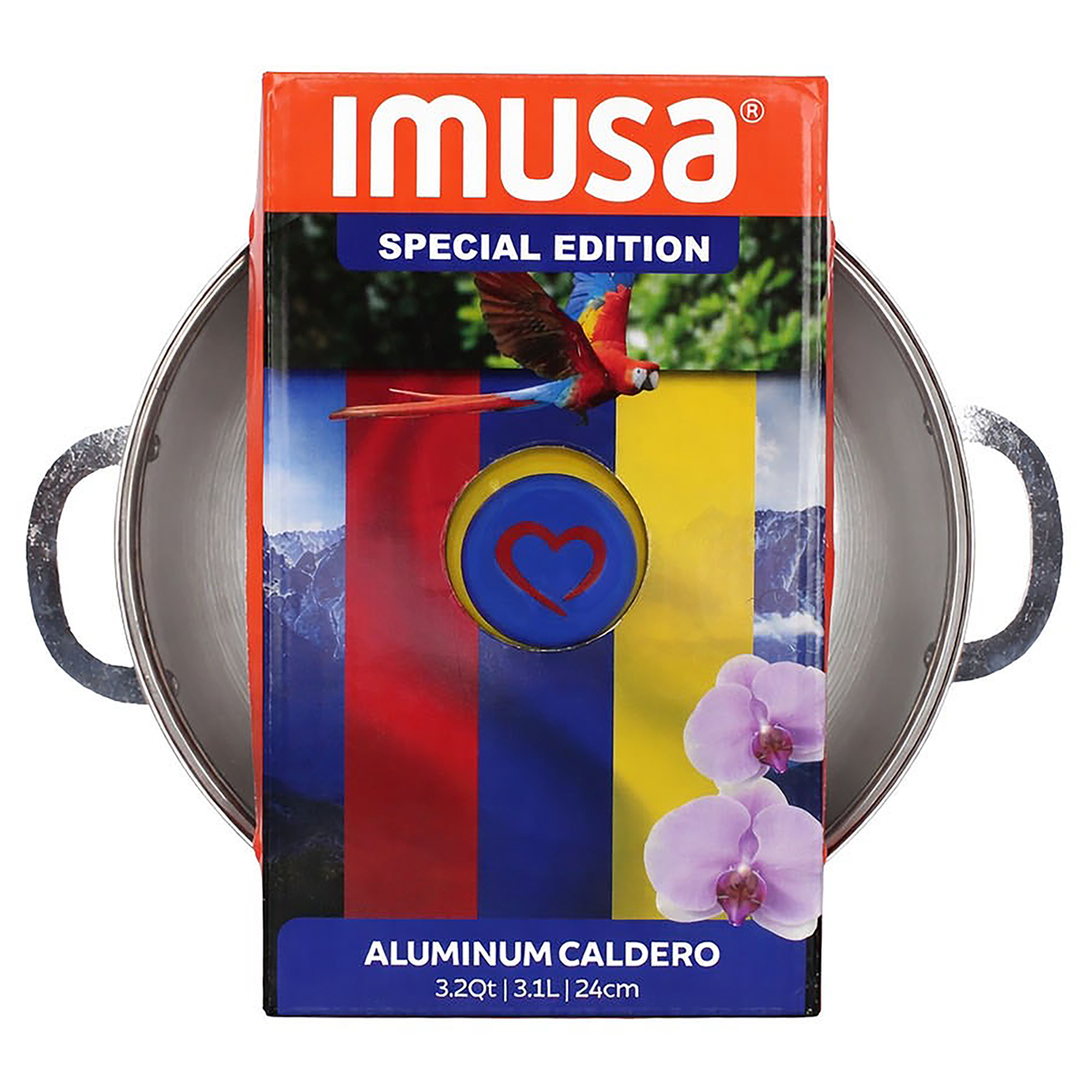 The IMUSA 3.2 Qt Caldero is inspired by the rich culinary traditions of Colombia, Ecuador, and Venezuela. Made of durable aluminum with a natural interior and polished exterior, it ensures even heat distribution and is oven safe when used without the lid. The tight-fitting glass lid features a steam vent and a knob imprinted with a red heart and the flag colors of yellow, blue, and red. Easy-grip cast aluminum handles provide secure handling while helping retain moisture and flavor. Perfect for arroz con pollo, arroz con coco, sancocho, caraotas negras, baking, and more. Trust the IMUSA 3.2 Qt Caldero for balanced, home-cooked meals. It will surely become your kitchen’s beloved companion, uniting tradition and innovation in every delectable creation and elevating your culinary experience.