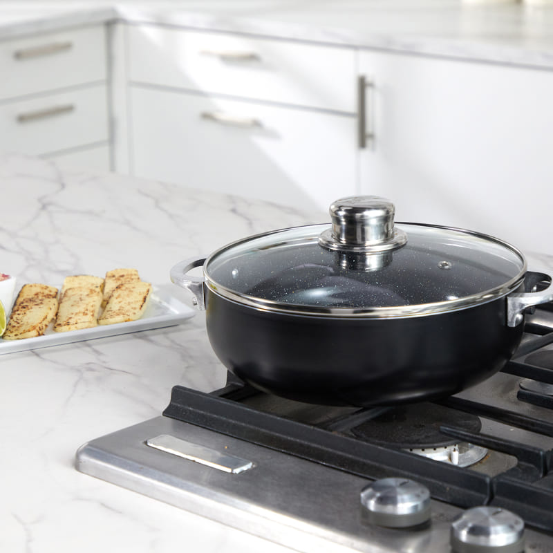 The IMUSA 3.2Qt Bistro-Cera Caldero is crafted from aluminum and features a stylish black speckled ceramic coating paired with a matte black exterior. Its ceramic non-stick surface ensures effortless food release and promotes healthier cooking. Designed with easy-grip riveted handles and a tight-fitting glass lid with a steam vent and stainless-steel knob, this caldero is oven safe when used without the lid. Ideal for cooking rice, simmering soups, beans, sauces, stews, baking, and more, it is especially suited for everyday use and Hispanic recipes, making it a versatile and essential kitchen tool. Trust the Bistro-Cera Caldero for balanced, home-cooked meals. It will surely become your kitchen’s beloved companion, uniting tradition, and innovation in every delectable creation and elevating your culinary experience.