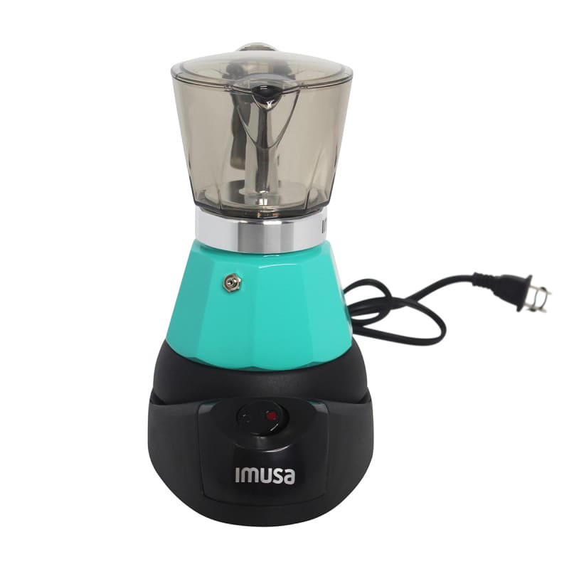 The IMUSA Teal Electric Espresso Maker is the perfect appliance for your coffee needs. This trendy coffee maker is made from cast aluminum with a bright teal finish, black base and a brown tinted tritan top. Use the IMUSA Teal Electric Espresso Maker to brew up to 3 or 2 cups of espresso coffee and you are ready to serve. The IMUSA Teal Electric Espresso Maker comes with a detachable base, an on/off switch of this coffeemaker, and a cool touch handle that enables safe operation and convenient pouring. Use this coffeemaker to make traditional espresso, Cuban coffee, Italian coffee, and Moka. Just fill the lower tank with water, place ground coffee in the funnel, and place the carafe on the electrical base. Press the easy one-touch button and the espresso maker will do the rest! Feel the coffeehouse experience in the comfort of your home with the IMUSA Teal Electric Espresso Maker, it will surely make every sip a moment to savor.