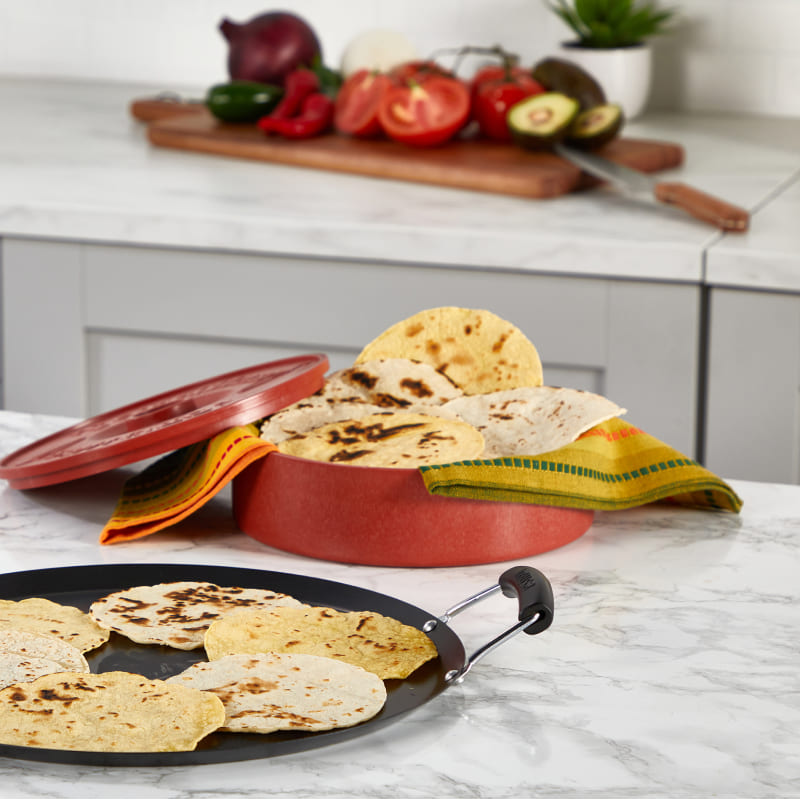 The IMUSA 8″ Terracota Tortilla Warmer, is a must-have kitchen accessory crafted for convenience and authenticity. Made from durable plastic, its terracotta color exterior adds a touch of warmth to any kitchen setting. The generous size of the IMUSA terracota Tortilla Warmer designed to accommodate a large quantity of tortillas, ensuring they remain fresh and can be served all at once. This tortilla warmer excels at keeping tortillas warm, heating them uniformly, and is great for reheating as well. The authentic design captures the essence of traditional culinary practices, and it is microwave-safe without the lid. Versatility is a key feature, as it can be used for a variety of items including tortillas, arepas, flatbread, pita bread, naan, pancakes, waffles, small pastries, and more. Whether for everyday use or special occasions like Taco Tuesday dinner parties and gatherings, the IMUSA terracota Tortilla Warmer adds a touch of practical elegance to your kitchen, making it an ideal choice for festivities and shared meals. Trust the IMUSA Terracota Tortilla Warmer as your go-to kitchen helper. It will surely become your kitchen’s beloved companion simplifying and enhancing your culinary endeavors.